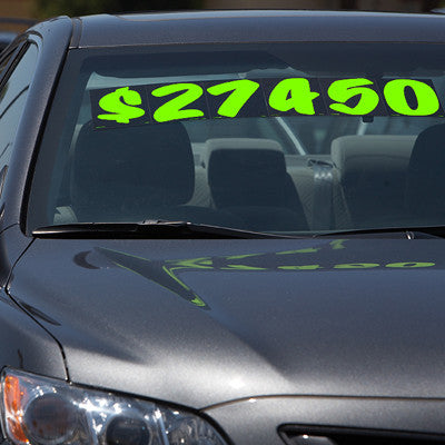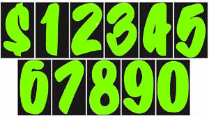 The Look of hand Painting but without the Cost or Hassle. Fluorescent Lime-Yellow on Black in a new script design, adhesive windshield number. An inexpensive yet highly effective sales tool to advertise a year model or price. Sold by the dozen {12 per pack}. Size: 7 1/2" tall x 4" wide. Neatly shrink wrapped in packs of a dozen with a chipboard backer to prevent curling during storage. Made of durable, waterproof vinyl, these bright, fluorescent numbers demand attention! Each number is slit on the back for easy application. Removable adhesive allows easy, clean removal. Please note these adhesive numbers are not reusable.Â