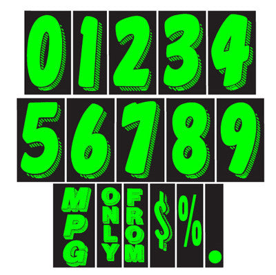 A larger version of The ORIGINAL Fluorescent Chartreuse, 3-D shaded design, adhesive windshield number. An inexpensive yet highly effective sales tool to advertise a year model or price. Sold by the dozen {12 per pack}. Size: 11 1/2" tall x 7" wide. Neatly shrink wrapped in packs of a dozen with a chipboard backer to prevent curling during storage. Made of durable, waterproof vinyl, these bright, fluorescent numbers demand attention! Each number is slit on the back for easy application. Removable adhesive allows easy, clean removal. Not sure what to get? Try our Starter Kit. See EZ130
