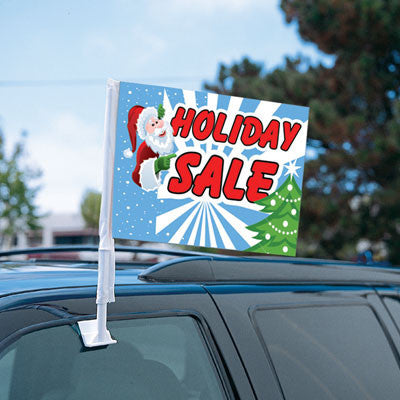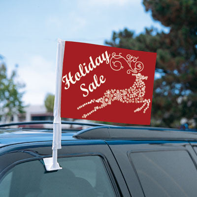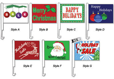 HAPPY HOLIDAYS! Show your customers the holiday spirit with these Clip-On Car Flags. Great for vehicles with retractable antennas or if you are concerned about damaging any antennas. Made of polyester cloth, each flag is 11 inches tall x 13 inches wide and sewn on a white sleeve which is attached to a 20 inches tall durable white plastic staff with molded clip. Staff is designed to easily attach to any car or truck window. Sold individually. Mix and match to obtain quantity discount price. Please Note: This product is designed to be used on a stationary vehicle located on a dealership lot.