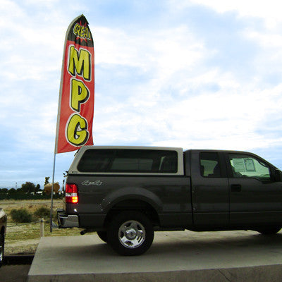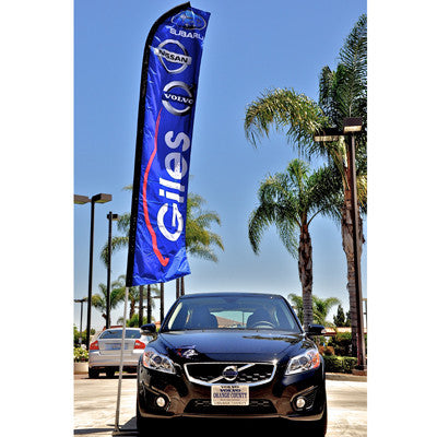 Draw attention with minimal effort with these Custom Single Sided 15 ft. tall giant flag kits!. Great for the front line or highlighting any vehicle, these flags flutter & flap with a slight breeze. However, unique design allows this flag to "fly" even when there is no wind. Completely portable, a flag can be moved any where on your lot in minutes. Each Kit includes one flag of your choice, a 4-piece flag pole and a Trailer Hitch Base. Each flag is 2 feet 5 1/2 inches wide x 11 feet 5 3/4 inches tall and has a sewn sleeve that easily slips over the specially designed flag pole. The 4-piece flag pole is made of anodized aluminum and is slightly over 15 feet tall. Create your own custom design.