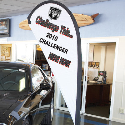 The elastic cord attached to the bottom of the flag is easily hooked onto a flange located on the bottom of the flag pole, keeping the flag taut and causing the top of the flag pole to bend, producing the curved look. Each tear drop shaped flag is 2 feet wide at its widest point and 6 feet 4 1/2 inches tall and has a sewn sleeve on the side that easily slips over the Showroom Ad-Flag Pole {EZ823}.