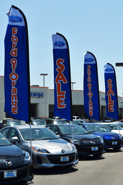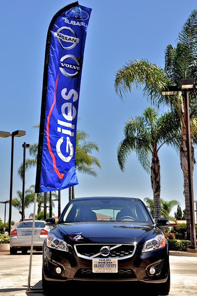 Draw attention with minimal effort with these Custom Single Sided 15 ft. tall giant flag kits!. Great for the front line or highlighting any vehicle, these flags flutter & flap with a slight breeze. However, unique design allows this flag to "fly" even when there is no wind. Completely portable, a flag can be moved any where on your lot in minutes. Each Kit includes one flag of your choice, a 4-piece flag pole and a base designed to be used under the tire of any vehicle. Each flag is 2 feet 5 1/2 inches wide x 11 feet 5 3/4 inches tall and has a sewn sleeve that easily slips over the specially designed flag pole. The 4-piece flag pole is made of anodized aluminum and is slightly over 15 feet tall. The u-shaped wheel base stand is made of galvanized steel and is designed to be placed under the tire of any vehicle. Create your own custom design.