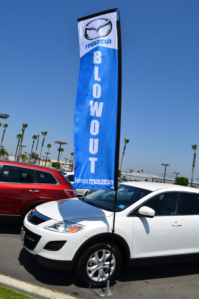 Custom Flat Top Flag Kit with Tire Base, Double Sided. High quality full digital printing. NO MINIMUM ORDER! These flags can be seen from down the block and read like a sign. Unique design allows this flag to "fly" even when there is no wind. Each flag is 2 feet 2 1/2 inches wide x 9 feet 8 1/2 inches tall and has a sewn sleeve on the top and side that easily slips over the Flat Top Flag Pole {EZ568}. Kit included one Custom Flat Top Flag, 4 piece pole with convenient storage/carry case, and Tire Base. Initial set up charge of $45.00 for each design. Some complex designs may incur additional charges.