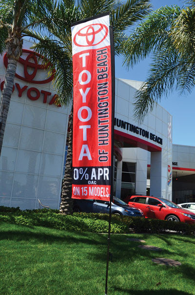 Full Color Digital Printed Custom Flat Top Flag printed on both sides. This flag is specially designed as a replacement flag for the Flat Top Flag & Pole Kit with Tire Base {EZ566} or for the Flat Top Flag & Pole Kit with Ground Spike {EZ567}. NO MIMIMUM ORDER! These flags can be seen from down the block and read like a sign. Unique design allows this flag to "fly" even when there is no wind. Each flag is 2 feet 2 1/2 inches wide x 9 feet 8 1/2 inches tall and has a sewn sleeve on the top and side that easily slips over the Flat Top Flag Pole {EZ568}. Initial set up charge of $45.00 for each design. Some complex designs may incur additional charges.