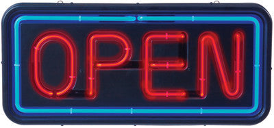 Bright Neon OPEN Sign Visable day and night! This Bright Neon red and blue sign is eye catching and features a long 10 foot cord and 40 watt output. Hanging Chaines included. 50/60 Hz input. UL Listed. Sign is 23 1/2" W x 3 1/2" D x 10 1/2" H.
