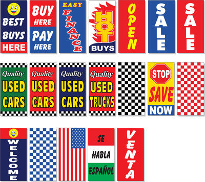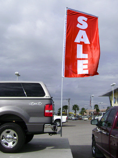 Draw attention with minimal effort with these 10 ft. tall giant flag kits!. Great for the front line or highlighting any vehicle. Unique design allows this flag to "fly" even when there is no wind. Flag rotates into the wind. Completely portable, a flag can be moved to another vehicle with a trailer hitch in minutes. Each Kit includes one flag of your choice, a 3-piece flag pole and a base designed to fit into the trailer hitch of a vehicle. Each single sided polyester flag is 3 feet wide x 6 feet tall and has two sewn sleeves that easily slip over the specially designed flag pole. The 3-piece flag pole is made of anodized aluminum and is slightly over 10 feet tall. The trailer hitch adapter base is made of anodized aluminum and is designed to fit into a vehicle's trailer hitch. Available in 19 different eye-catching designs.
