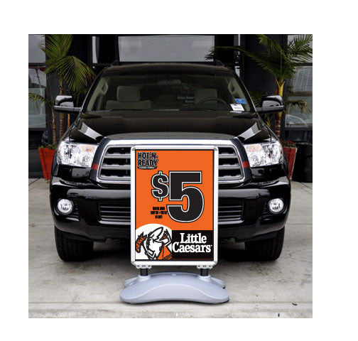 Although sturdy as is, the silver colored hollow plastic base can hold water or sand for additional ballast. Moving this sign is easy, just tip and roll since the base has a convenient molded handle and two wheels.
