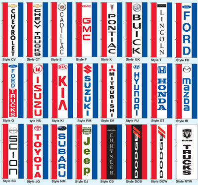 Dress Up Your Front Line Light Poles with Flags that Always Fly! Made from 100% nylon, these Red, White & Blue flags are 3 feet wide x 8 feet tall. Printed in black ink on one side only, these flags have heavy bleached cloth headings with four strong brass grommets along the vertical side. Each flag includes four self-locking nylon straps that fit up to an 10" diameter pole. Each flag has a special sleeve sewn at the top & bottom to accommodate an Pole Bracket. If installing one Everwave Vertical Dealer Flag per light pole, then two 3 ft. Pole Brackets {EZ984} are required per flag. If installing two Everwave Vertical Dealer Flags per light pole, then two 6 ft. 4" Pole Brackets {EZ971} are required per pair of flags. Order Pole Brackets separately. 21 different manufacturer brands to choose from. Note: These flags are available for exclusive use by authorized dealers only.
