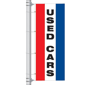 Dress Up Your Front Line Light Poles with Flags that Always Fly! Made from 100% nylon, these Red, White & Blue flags are 3 feet wide x 8 feet tall. Printed in black ink on one side only, these flags have heavy bleached cloth headings with four strong brass grommets along the vertical side. Each flag includes four self-locking nylon straps that fit up to an 10" diameter pole. Each flag has a special sleeve sewn at the top & bottom to accommodate an Pole Bracket. If installing one Everwave Vertical Slogan Flag per light pole, then two 3 ft. Pole Brackets {EZ984} are required per flag. If installing two Everwave Vertical Slogan Flags per light pole, then two 6 ft. 4" Pole Brackets {EZ971} are required per pair of flags. Order Pole Brackets separately. 13 messages to choose from.Â