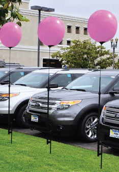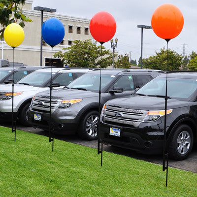 Draw attention to your front line! Large reusable balloons are now front and center using our new pole kit. 38 New Styles! NO HELIUM NEEDED! Designed to be used with any landscaped or grassy area. Kit includes one 35" tall sturdy aluminum pole, one 30" tall fiberglass & reinforced plastic Balloon Holder, one Balloon Adapter, one 27" tall steel Ground Spike and your choice of one Reusable Balloon. The sturdy Ground Spike insures your pole will not tip over. Simply use your foot or a hammer to implant the spike into the ground. Unique twist notch-lock design allows these Balloon Holders to be safely and securely interchanged with our Reusable Balloon Window Kit (EZ529). Overall height (including Reusable Balloon) is 8 feet. Parts are also sold seperately, Don't forget our Quick Flow Deluxe Balloon Inflator EZ512.