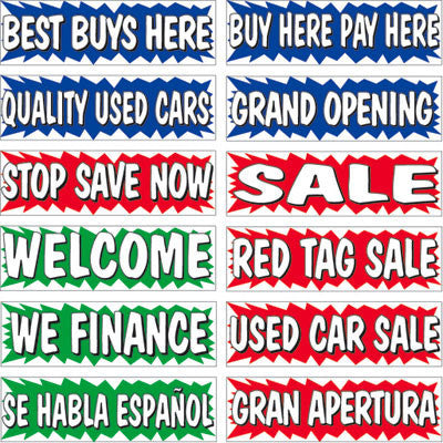 New, clean vibrant design. Made of heavy-duty, reinforced, weatherized vinyl with grommets. 5 ft. rope ties included. Printed on one side only 12 messages to choose from. Only available in the colors shown.