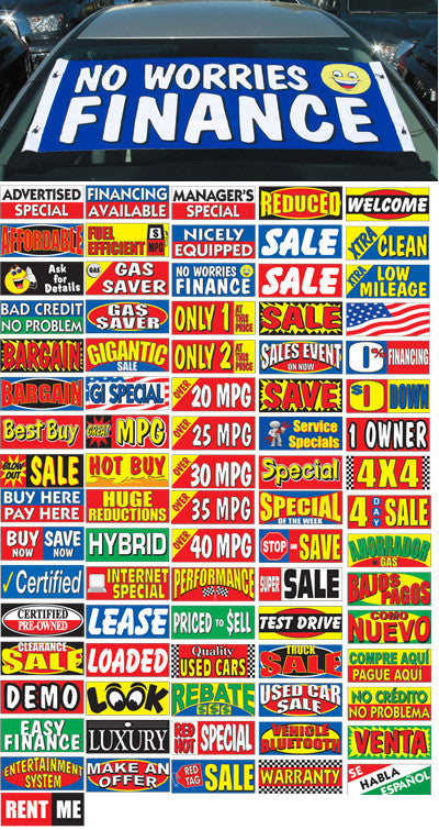Put your message where it can be easily seen while keeping the vehicle interior cool. Unique design incorporates two elastic cords on each banner end for easy attachment to each of the vehicle's side mirrors. Fits virtually any windshield. The 1ft. 8 inch tall x 4 ft. 2 inch wide banner is made of heavy-duty, reinforced, weatherized vinyl. Reusable and easy to take off for test drives. 81 messages to choose from.