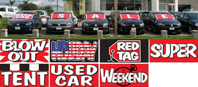 Put before your SALE or SAVE kit to attract customers! Put your kit message where it can be easily seen while keeping the vehicle interior cool. Unique design incorporates two elastic cords on each banner end for easy attachment to each of the vehicle's side mirrors. Fits virtually any windshield. Each 2 foot tall x 4 foot 2 inch wide letter banner is made of heavy-duty, reinforced, weatherized vinyl. Reusable and easy to take off for test drives.