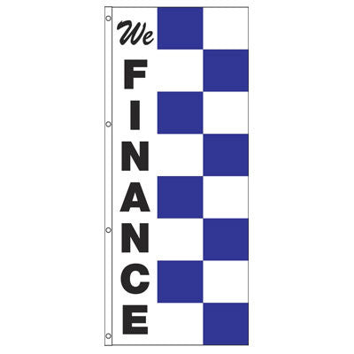 3' x 8', They are made of blue & white checkered ultra-rugged "Dura-Knit" polyester fabric. These flags have a durable canvas header with four strong brass grommets along the left vertical side. Message is printed in black ink on one side only.