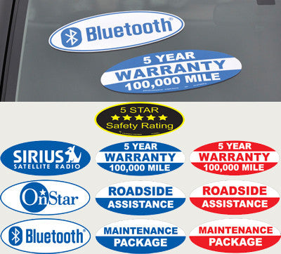 Advertise special features with these adhesive oval slogans! 5 1/2 inches tall x 14 inches long. Neatly shrink wrapped in packs of a dozen with a chipboard backer to prevent curling during storage. Made of durable, waterproof vinyl, these non-fade signs demand attention! Completely die-cut and slit on the back for easy application. E-Z on E-Z off, leaves no gummy residue.