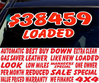 Get the look of painted windshields with these Red and White die cut slogan decals. E-Z on and E-Z off, leaves no gummy residue. The waterproof vinyl die cut numbers are slit on the back for easy application and are shrink wrapped and sold by the dozen. Slogans are 13 1/2 inches long x 3 1/2 inches tall. Use with our Red & White Die Cut Numbers E-Z 258. |