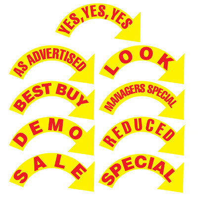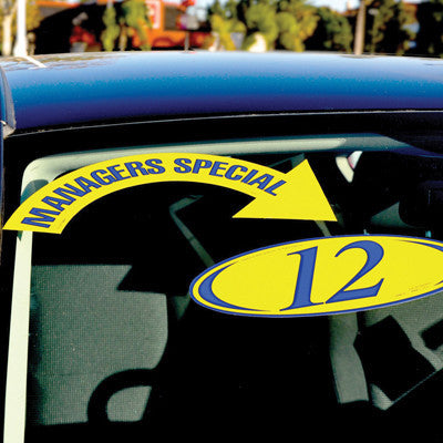 These Arrow Slogans Help You Make Your Point! Made with non-fade inks, these Bright Red on Yellow windshield decals get your message across. Use an Arrow Slogan to emphasize a feature in addition to pointing out the year model or price. Made of waterproof vinyl with a removable adhesive. Each Arrow Slogan is approximately 2 1/2 inches wide x 13 inches long. Sold in neatly shrink wrapped packs of 12.