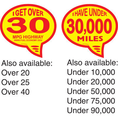 Let Your Vehicle do the Talking! Bright Red and Yellow bubble shaped, adhesive windshield decal. An inexpensive yet highly effective sales tool to advertise mileage or miles per gallonl! Sold by the dozen {12 per pack}. Size: 7 1/2 inches tall x 9 inches wide . Neatly shrink wrapped in packs of a dozen with a chipboard backer to prevent curling during storage. Made of durable, waterproof vinyl, these bright, non-fade signs demand attention! Each sign is slit on the back for easy application. Removable adhesive allows easy, clean removal.
