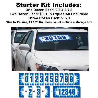 First time ordering or don't know what you want, try our convenient starter kit. This kit contains 20 dozen Ultra Blue & Bright Blue on White background, explosion design 11 1/2" tall adhesive windshield numbers. Unique modular design allows you to "build your own" windshield pricing or year model in minutes. The 20 dozen consist of the following: one doz. of #2, #3, #4, #6, #7, #8, two doz. of #1, #$, #0, Explosion End and three doz. #5, #9. Sold by the dozen {12 per pack}. Size: 11 1/2" tall x 3 1/2" wide. Neatly shrink wrapped in packs of a dozen with a chipboard backer to prevent curling during storage. Made of durable, waterproof vinyl, these bright Sunbuster non-fade numbers demand attention! Each number is slit on the back for easy application. Removable adhesive allows easy, clean removal. Please note these adhesive numbers are not reusable.
