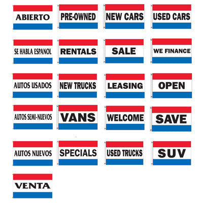 Made of red, white and blue nylon. These 100% nylon flags have heavy bleached cloth headings with two strong brass grommets. Printed in black ink on one side only. 14 messages to choose from.