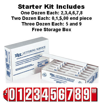 First time ordering or don't know what you want, try our convenient starter kit. This kit contains 20 dozen White number on Brilliant Red background with Black Shadowing (for extra pop),adhesive windshield number and includes a free handy storage box. Unique modular design allows you to "build your own" Red Tag pricing in minutes. The 20 dozen consist of the following: one doz. of #2, #3, #4, #6, #7, #8, two doz. of #1, #$, #0, Red Tag End and three doz. #5, #9. Sold by the dozen {12 per pack}. Size: 9 1/4" tall x 4 3/8" wide. Neatly shrink wrapped in packs of a dozen with a chipboard backer to prevent curling during storage. Made of durable, waterproof vinyl, these bright Sunbuster non-fade numbers demand attention! Each number is slit on the back for easy application. Removable adhesive allows easy, clean removal. Please note these adhesive numbers are not reusable. (EZ 180 addtional individual numbers)
