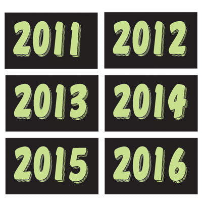 Four digit fluorescent year model signs are 5 3/4" high x 9 1/2" long and made of durable waterproof vinyl. Shrink wrapped and sold by the dozen. Slit on the back for easy use. E-Z on and E-Z off, leaves no gummy residue.