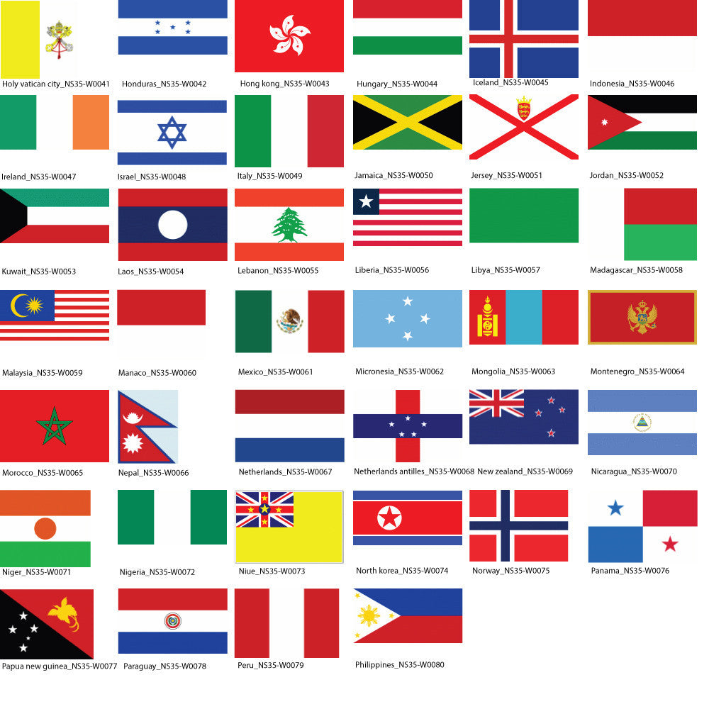 Our country flags are 3 feet by 5 feet in dimension and made of polyester with 2 metal grommets.