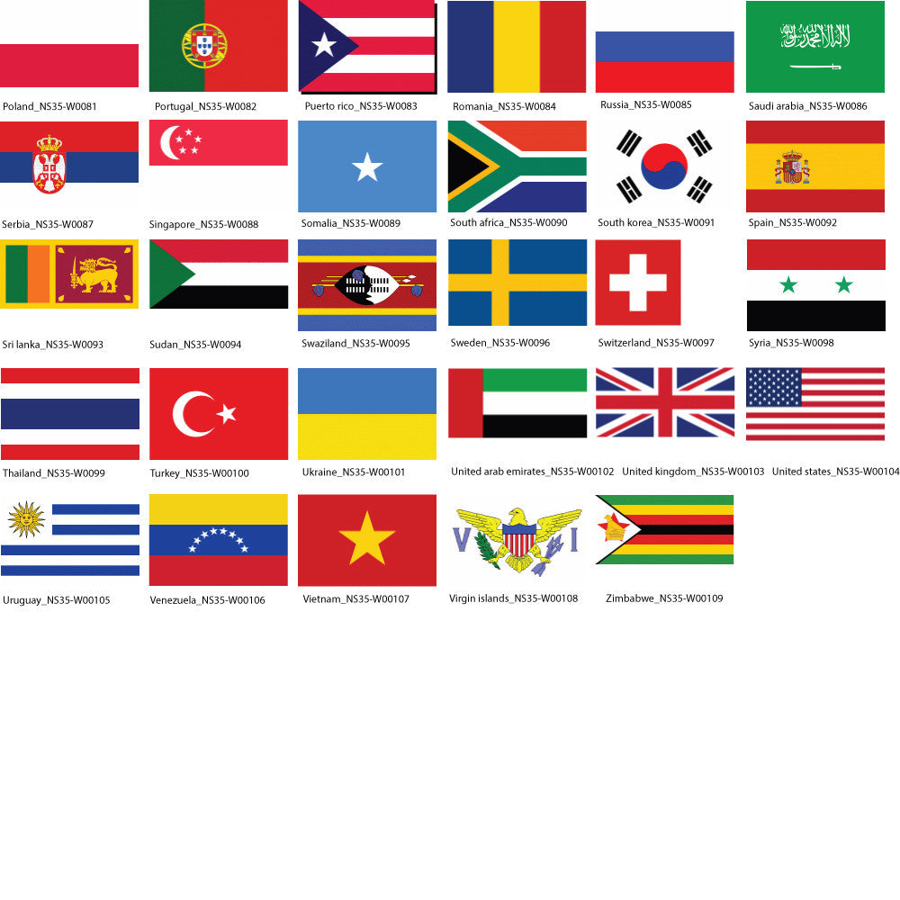 Our country flags are 3 feet by 5 feet in dimension and made of polyester with 2 metal grommets.