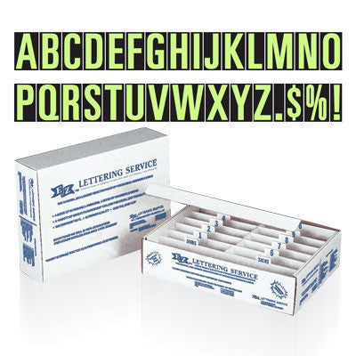 First time ordering or don't know what you want, try our convenient starter kit. This kit contains 30 dozen Fluorescent Lime-Yellow on Black 5 1/2" tall adhesive windshield letters. The 30 dozen consist of 1 dozen of each letter plus 1 dozen . decimal points, $ signs, % signs and ! exclamation points. These letters are an inexpensive yet highly effective sales tool to create a custom message!. Size: 5 1/2" tall x 2 3/8" wide. Neatly shrink wrapped in packs of a dozen {12 decals} with a chipboard backer to prevent curling during storage. Made of durable, waterproof vinyl, these non-fade numbers demand attention! Each number is slit on the back for easy application. Removable adhesive allows easy, clean removal. Please note these adhesive numbers are not reusable. Additional individual letters (EZ 134) |