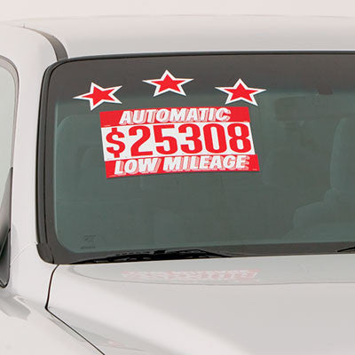 Red & White adhesive windshield number. An inexpensive yet highly effective sales tool to advertise a year model or price. Sold by the dozen {12 per pack}. Size: 5 1/2" tall x 2 1/2" wide. Neatly shrink wrapped in packs of a dozen with a chipboard backer to prevent curling during storage. Made of durable, waterproof vinyl, these bright non-fade numbers demand attention! Each number is slit on the back for easy application. Removable adhesive allows easy, clean removal. Not sure what to get? Try our Starter Kit. See EZ123