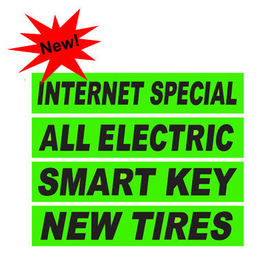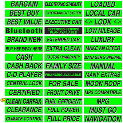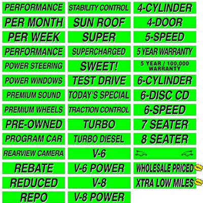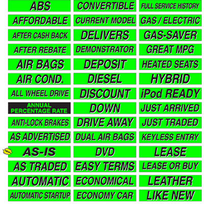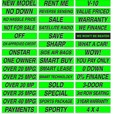 Fluorescent Chartreuse, 3-D shaded design adhesive windshield sign. An inexpensive, yet highly effective sales tool to advertise a feature or selling point! Size: 15" long x 2 3/4" tall. Sold by the dozen {12 per pack}. Neatly shrink wrapped in packs of a dozen with a chipboard backer to prevent curling during storage. Made of durable, watrerproof vinyl, these bright, fluorescent signs demand attention! Each sign is slit on the back for easy application. Removable adhesive allows easy, clean removal.Â