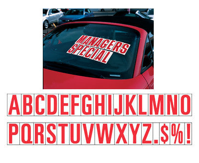 Bright Red on White adhesive windshield letter. An inexpensive yet highly effective sales tool to create your own custom message!. Sold by the dozen {12 per pack}. Size: 5 1/2" tall x 1 1/8" wide. Neatly shrink wrapped in packs of a dozen with a chipboard backer to prevent curling during storage. Made of durable, waterproof vinyl, these bright, fluorescent numbers demand attention! Each number is slit on the back for easy application. Removable adhesive allows easy, clean removal. Please note these adhesive numbers are not reusable.Â