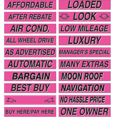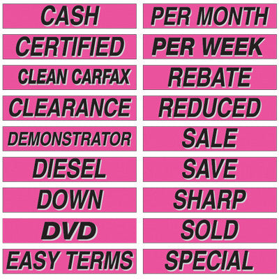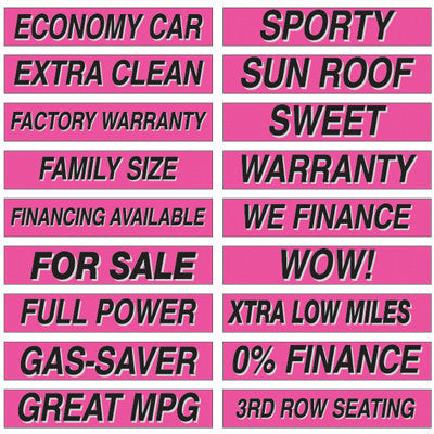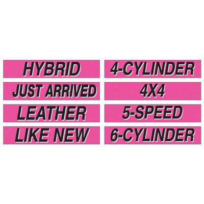 Fluorescent Pink, 3-D shaded design adhesive windshield sign. An inexpensive, yet highly effective sales tool to advertise a feature or selling point! Size: 15" long x 2 3/4" tall. Sold by the dozen {12 per pack}. Neatly shrink wrapped in packs of a dozen with a chipboard backer to prevent curling during storage. Made of durable, watrerproof vinyl, these bright, fluorescent signs demand attention! Each sign is slit on the back for easy application. Removable adhesive allows easy, clean removal.Â