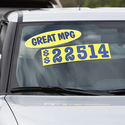 New designer look with non-fade inks! Deep Blue on Super Bright Yellow background adhesive windshield number. An inexpensive yet highly effective sales tool to advertise a year model or price. Sold by the dozen {12 per pack}. Size: 5 1/2" tall x 3" wide. Neatly shrink wrapped in packs of a dozen with a chipboard backer to prevent curling during storage. Made of durable, waterproof vinyl, these bright, non-fade numbers demand attention! Each number is slit on the back for easy application. Removable adhesive allows easy, clean removal.Quantity Discount Price available on 25 dozen or more. Not sure what to get? Try our Starter Kit. See EZ227