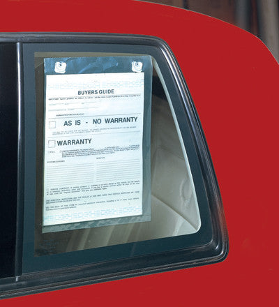 No more messy adhesives, scraping & cleaning windows or removing crumbled guides from inside door panels. Each 8 1/2" wide x 13" tall holder consists of two suction cups, two clips to securely fasten the two suction cups to the 4 mil. clear plastic bag and one wire stiffener that rests at the bottom of the bag to prevent curling in the sun. Easy to install, insert pouch inside window glass. Two suction cups hold pouch in place. Great for demo rides - easy to remove. Reusable. Sold in packs of 50. Quantity Discount Prices available on 5 or more packs.