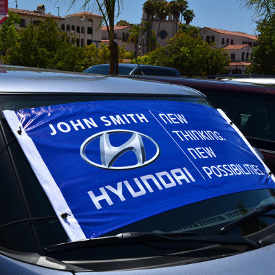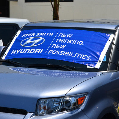 Put your custom message where it can be easily seen while keeping the vehicle interior cool. Unique design incorporates two elastic cords on each banner end for easy attachment to each of the vehicle's side mirrors. Fits virtually any windshield. The 1ft. 8 inch tall x 4 ft. 2 inch wide banner is made of heavy-duty, reinforced, weatherized vinyl. Reusable and easy to take off for test drives.