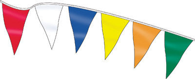 The Best Value for Your Money! Made of 4 mil. polyethylene, 60 pennants are sewn on a 120 ft.nylon rope. Each pennant is 12 inches wide x 18 inches tall. 10 color combinations are available. Multicolor and Red/White/Blue are usually in stock. Other colors available in approximately eight working days.