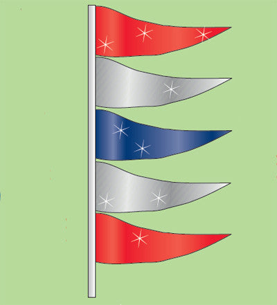 Outshine Your Competition! Made of brilliant, shiny metallic plastic, five 4" x 12" pennants are sewn on a 32" sleeve. Slides over antenna, or for retractable antennas, use with antenna mast {EZ520} or window clip kit {EZ337}. Available in 15 color combinations. Sold in packs of a dozen (12).