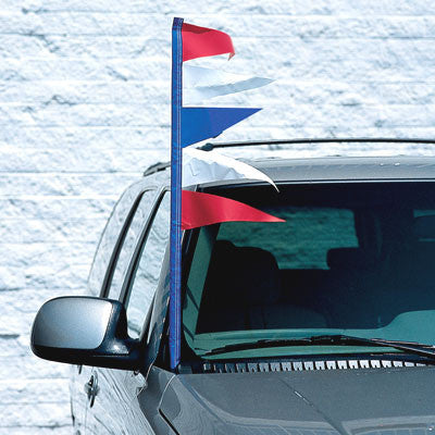 Dress Up Your Front Line! Made of heavy duty plasticloth, five 4" x 12" pennants are sewn on a 32" sleeve. Slides over antenna, or for retractable antennas, use with antenna mast {EZ520} or window clip kit {EZ337}. Available in five different color combinations. Sold in packs of a dozen (12).