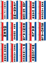 Flags are 3' x 8'. Made of red, white and blue nylon, these 100% nylon flags have heavy bleached cloth headings with four strong brass grommets along the left vertical side. Printed in black ink on each side, these messages can be read from either side. 15 messages to choose from. Each flag includes four self-locking nylon straps that fit up to an 8" diameter pole.