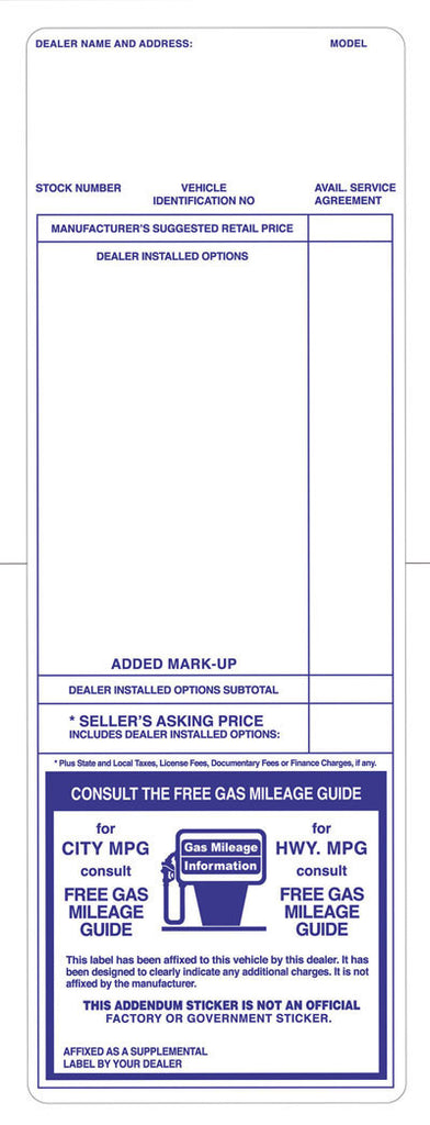 Now you can have easy acceptance for your add-ons! These stickers are available in fade resistant blue and work in harmony with the manufacturer's tag. The design incorporates plenty of space to list your additional options and delivery charges. Stickers are 4 1/4" wide x 11" tall. Sold in packs of 100. Quantity Discount Prices available on quantities of 3 and 5 or more packs.