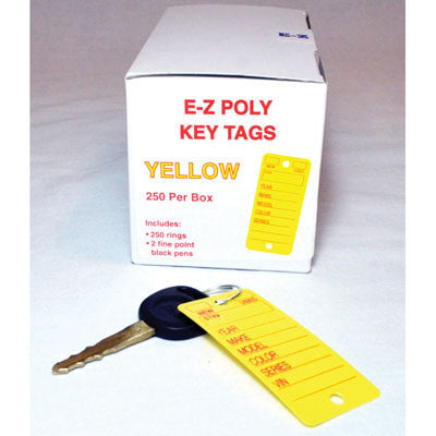 Made of indestructible polyethylene, these key tags are waterproof, fade proof and won't tear at the ring. Round corners won't catch or tear pocket linings. Available in white or yellow. Each box of 250 includes key tags, chrome plated rings and 2 fine black pens. Key tag is 1 3/8" x 3". Imprinted sections for New, Used, Stk#, Year, Make, Model, Color, Series, VIN.Â