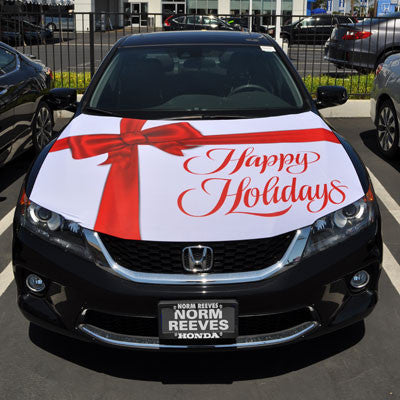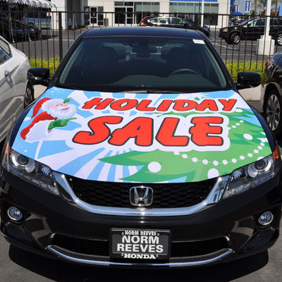 New! Medium Holiday Flag Hoodies™. Add instant impact to your front line or featured vehicles in seconds. The fitted stretch polyester fabric wraps around the hood of the vehicle with ease. Simply open the vehicle’s hood to apply; the elastic edge will secure the Flag Hoodie™ . Once vehicle hood is closed, the Flag Hoodie™ cannot be removed. Great for test drives! Soft polyester material guaranteed not to scratch the paint of the vehicle. Fits most Cars and Trucks! Large Size 4' 9" wide by 3' 3" tall.