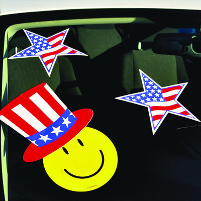 Show Your Colors! Use these patriotic stars to showcase your cars. Sold by the dozen {12 per pack}. Size: 8 inch diameter. Neatly shrink wrapped in packs of a dozen with a chipboard backer to prevent curling during storage. Made of durable, waterproof vinyl, these stars are made of non-fade inks. Each star is slit on the back for easy application. Removable adhesive allows easy, clean removal. Great for use with our EZ446-Hat and EZ184 Happy Face.