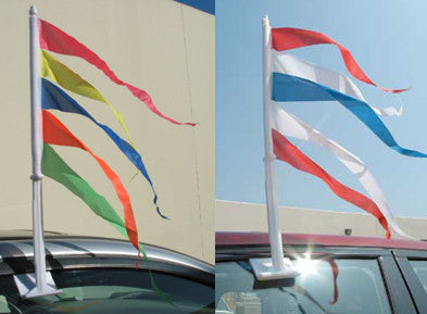 Great for vehicles with retractable antennas or if you are concerned about damaging any antennas. Made of 1 ply polyester cloth, there are five triangle shaped pennants per clip. Each pennant is 14 1/4 inches long x 2 1/4 inches wide that tapers to a point. The pennants are sewn on a white sleeve which is attached to a 20" tall durable white plastic staff with molded clip. The staff is designed to easily attach to any car or truck window. Sold individually. Two different color combinations available. Mix & match to obtain quantity discount price. Please Note: This product is designed to be used on a stationary vehicle located on a dealership lot.