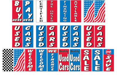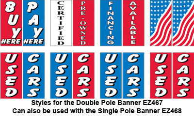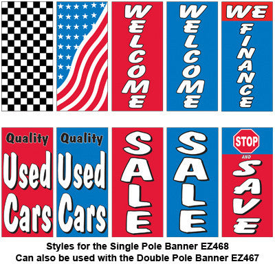Giant Double Sided Stock Message Single Pole Banners are a great way to get your lot noticed day and night. Many banner styles to choose from! Each banner is 3' x 8' with double sewn hem and are printed on both sides. Made of heavy duty 18 ounce tear and weather proof vinyl. Each Banner comes with 4 nylon straps. For complete kits see EZ468 or EZ467.