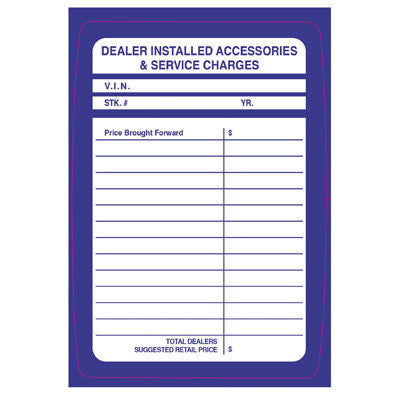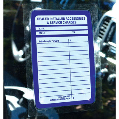 Dealer Add-On Stickers. Adheres to the inside of the window to show your customers accessories and services added. 250 per pack. 4 1/2" wide x 6" tall. Clear polyester backing. Easy to apply and remove.