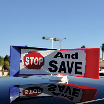 The EZ Twirl Ad car top sign spins in the wind as it sits atop the vehicle. The plastic coated magnetic base attaches easily and strong yet won't scratch painted surfaces. It is 6 1/2" X 17" and can hold 3 inserts(sold seperately). Each message insert is made of durable, flexible plastic and is 5" tall x 14" long. Inserts can be ordered individually (each Twirl-N-Ad requires three inserts). Inserts can be easily changed and are reusable. 40 different messages available.