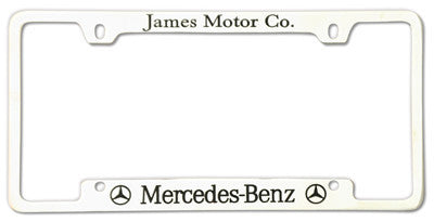 Recessed Metal License Frame. Ideal for high-end vehicles. Made of high quality zinc with recessed letters. Imprint available in standard colors. Select epoxy lettering for supreme quality. Minimum quantity is 250. Approximate production time 12-16 weeks after artwork has been approved. Quantities available: 250,500,1000,2500 and 5000(+). Custome logos or intricate lettering and shapes will incur an additional art charge.