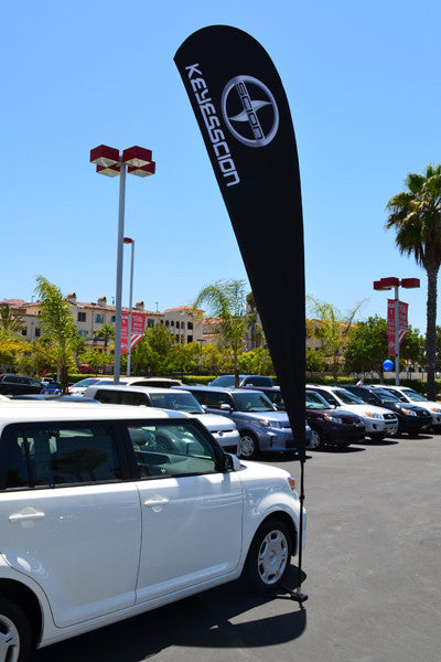 Minimum order of only 1! Modern design gets your custom two sided message across in a professional manner. These large flags are great for the front line or highlighting any vehicle. Each kit includes: one Paddle Flag, 4 piece Pole with convenient heavy duty storage/carry case and a Ground Spike. Easy assembly required. Printed on both sides, each nylon flag is 12 feet 10 inches tall and 2 feet 9 inches wide at its widest point and has a sewn sleeve on the side that easily slips over the Pole. Made from special state-of-the-art lightweight material , the Pole is easy to assemble & store and guaranteed not to break. Made of heavy duty steel, the Ground Spike has a 14 1/4 inch long spike and a spindle, allowing the flag to pivot into the wind, reducing wear and tear on the flag.